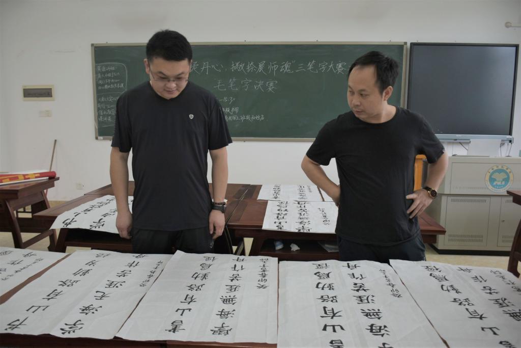 为进一步弘扬中华优秀传统文化,传承书法文明风采,5月9日下午,我院于我校东校区明德楼204教室开展“粉墨凝丹心,撇捺展师魂”三笔字大赛之毛笔字决赛,我院教师裴杰、周向阳担任评委,我院学生参加。