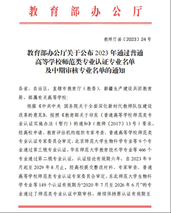 近日,教育部办公厅公布了2023年通过普通高等学校师范类专业认证专业名单及通过中期审核专业名单,我院小学教育、学前教育专业通过普通高等学校师范类专业第二级专业认证,认证结论有效期为六年,自2023年9月起至2029年8月止。