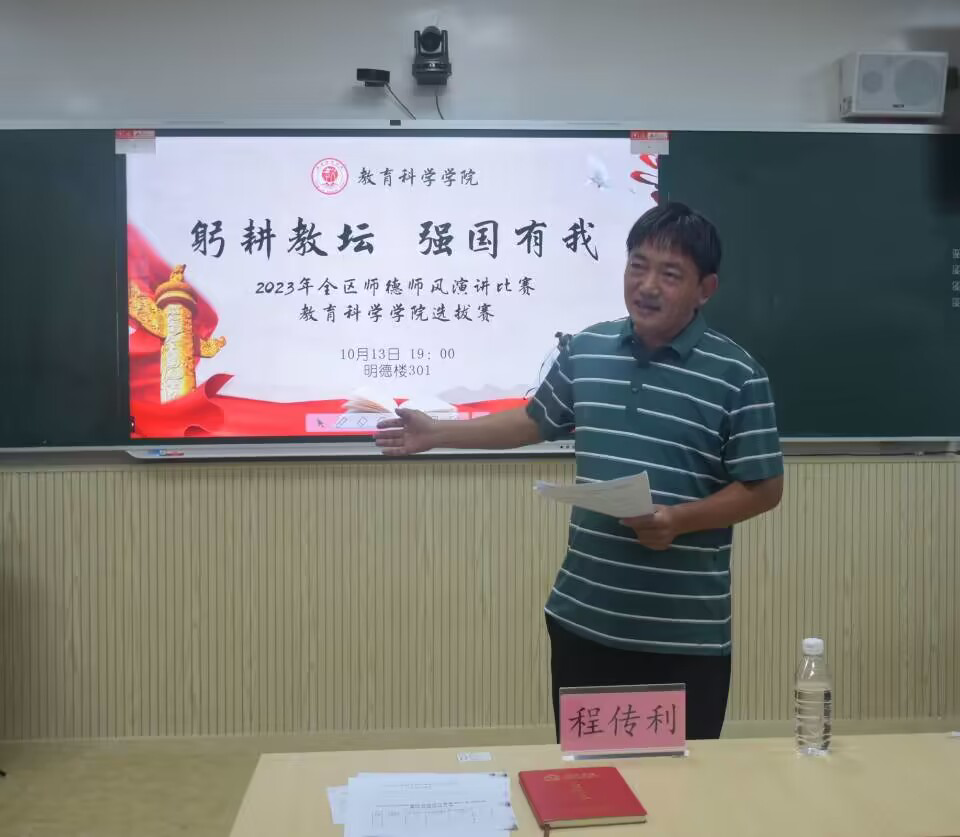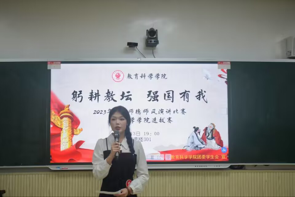 为提高师范生语言表达能力和综合素质,展现未来教师风采,进一步营造尊师重教氛围,10月13号晚,我院在东校区明德楼301教室开展“躬耕教坛 强国有我”2023年全区师德师风演讲比赛——教育科学学院选拔赛。本次比赛由我院小学教育理科(定向)2022(2)班邱盈担任主持人,我院副院长程传利,教师钟武媚、陈峥婷担任评委,我院学生代表到场参加。