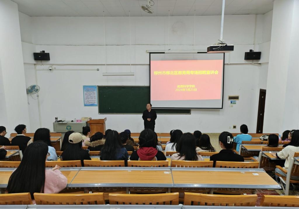 为更好拓宽毕业生就业渠道,进一步加强与柳州市柳北区教育局的合作交流,切实做好毕业生就业教育。3月21日下午,我院于我校东校区明德楼412教室举办柳州市柳北区教育局专场招聘宣讲会,柳州市柳北区教育局副局长黄迪、学院辅导员李泽荣、双方代表教师及2024届毕业生参加宣讲会。