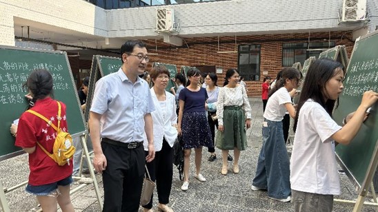 开幕式结束后,在我校明德楼一楼举行了粉笔字决赛,粉笔字作为师范生的基本素养和核心技能,也是传承文明、启迪智慧的重要工具。大赛通知一经发布,便得到了广大师范生的积极响应。他们纷纷投入到紧张的备战中,通过查阅资料、请教老师、互相切磋等方式,提升自己的粉笔字书写水平。可以说,此次大赛不仅是一场技能竞赛,更是师范生们自我提升、相互交流的盛会,本次决赛采用现场书写的形式,赛场气氛热烈,选手们神态专注,观众们热情高涨,在比赛过程中,选手们展现出了极高的书写水平和扎实的基本功。评委们也以其专业的眼光和丰富的经验,对选手们的作品进行了详细点评,指出了他们的优点和不足。