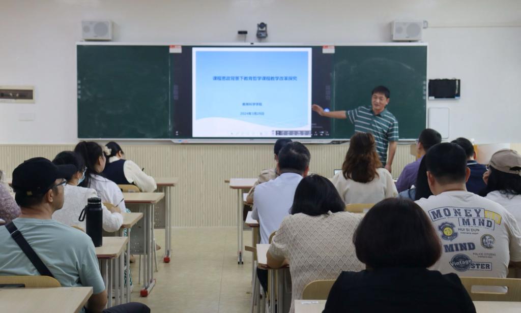 会上,程传利指出,课程思政应以立德树人为中心,遵循“八个相统一”原则,以“四新”标准为指导,以培养中国学生发展核心素养为出发,结合课程实际进行建设。他以课程《教育哲学》为例,从教学设计理念、教材的处理与创新、教学目标分析、教学重难点分析、学情分析、教法学法分析和具体的教学方法分析七个方面详细讲述了课程思政与教学改革的方法与要点,同时辅以生动的案例进行解析。此外,程传利还特别强调课堂教学的“三贴近”原则:贴近学情、贴近生活、贴近社会热点。在风趣幽默的语言氛围中,与会教师们受益良多。