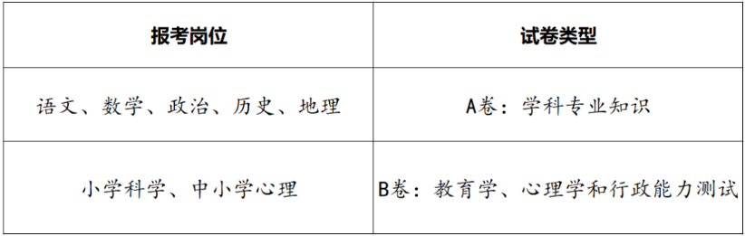 笔试按测试内容分为A、B两种试卷类型。A卷测试内容为学科专业知识,B卷测试内容为教育学、心理学和行政能力测试。具体岗位测试内容见下表: