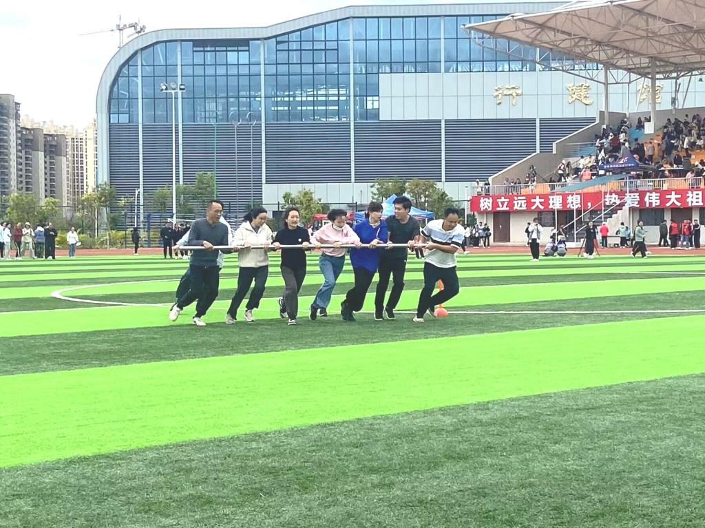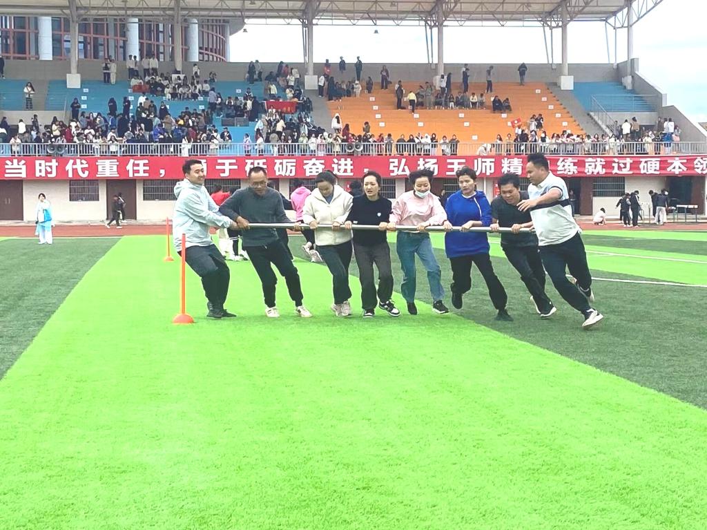 比赛前,教职工跃跃欲试,在原地热身后做好准备姿势,一字排开,蓄势待发,精神饱满,眼神坚毅望向终点,充满自信从容,只为在比赛中一展风采。随着裁判的一声哨响,教职工双手紧握铁棒,脚下猛地发力,与队友保持成行疾速奔向旋转点。现场一阵此起彼伏的欢呼声,在场观众强有力的喝彩给运动员更大动力,脚下步伐更加轻快,身姿更加矫健。教职工手中木棒紧紧相握,木棒连接的是力量,代表的是团结,始终横着的木棒象征着一往无前。接近终点时,现场气氛到达高潮,加油的呐喊一声盖过一声,一浪盖过一浪,在热烈紧张的氛围中,教职工先后冲过终点,本次比赛也逐渐落下帷幕。