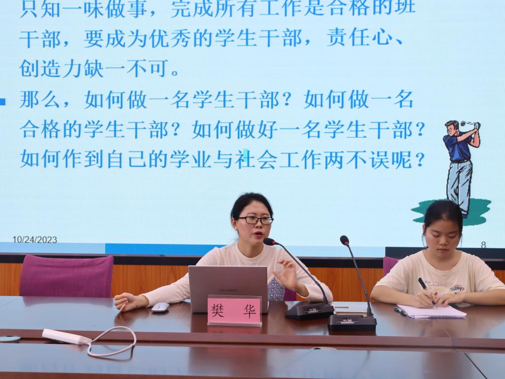 会上,樊华首先围绕个人与集体关系、班级干部在集体中扮演角色、班干工作意义等五方面展开详细阐述。其间,她表示,担任班级干部是提高自身素养、创造能力及管理水平的重要途径,是班主任组建班集体、建设班集体不可缺少的力量与核心。随后,她指出,作为班级干部要具备良好心理与身体素质;成为一名优秀班级干部,需具备较强政治素质和学习能力、卓越执行力和人格魅力。最后,她传达我院网络意识形态工作相关要求。她强调,各班班长、网宣委员要提高思辨能力,从多角度思考问题,积极发挥班级干部正面引导与榜样带头作用;积极做好班级正面宣传和引导,避免转载、借用网络内容引发版权问题;选择恰当反馈诉求的渠道和方式,若遇到问题时可积极寻求老师帮助。